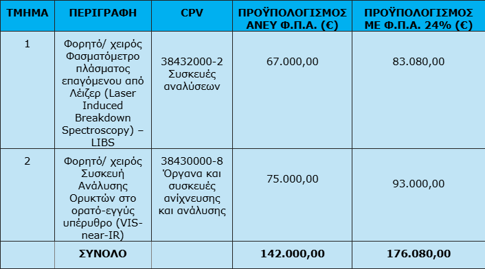 ΑΝΤΙΚΕΙΜΕΝΟ: Η ΕΑΓΜΕ, με σταθερό γνώμονα την αξιοποίηση του ορυκτού πλούτου προς όφελος της Εθνικής Οικονομίας υλοποιεί το έργο «Δράσεις Έρευνας & Αξιοποίησης Κρίσιμων Ορυκτών Πρώτων Υλών για τη στήριξη της Πράσινης Συμφωνίας/Ανάπτυξης και την Εφαρμογή της Κυκλικής Οικονομίας» με τη συντομογραφία ΚΟΠΥ. Μεταξύ άλλων, στόχος του προγράμματος είναι η σταδιακή αξιολόγηση εμφανίσεων μεταλλικών και μη μεταλλικών ορυκτών πρώτων υλών, με έμφαση στις κρίσιμες πρώτες ύλες, σε νέες περιοχές και σε επιλεγμένους ΔΜΧ, η έρευνα αξιοποίησης παραπροϊόντων/απορριμμάτων εκμεταλλεύσεων. Για την υποστήριξη των παραπάνω δράσεων η ΕΑΓΜΕ διαθέτει διαπιστευμένα κατά ISO 17025:2017 θεματικά εργαστήρια τα οποία εκτελούν πλήθος πρότυπων δοκιμών. Για την υποστήριξη των εργαστηρίων της και του εξοπλισμού αναλύσεων υπαίθρου, η ΕΑΓΜΕ προτίθεται να ανανεώσει ή να εξοπλιστεί με νέο εξοπλισμό που αποτελεί αντικείμενο της παρούσης διακήρυξης.